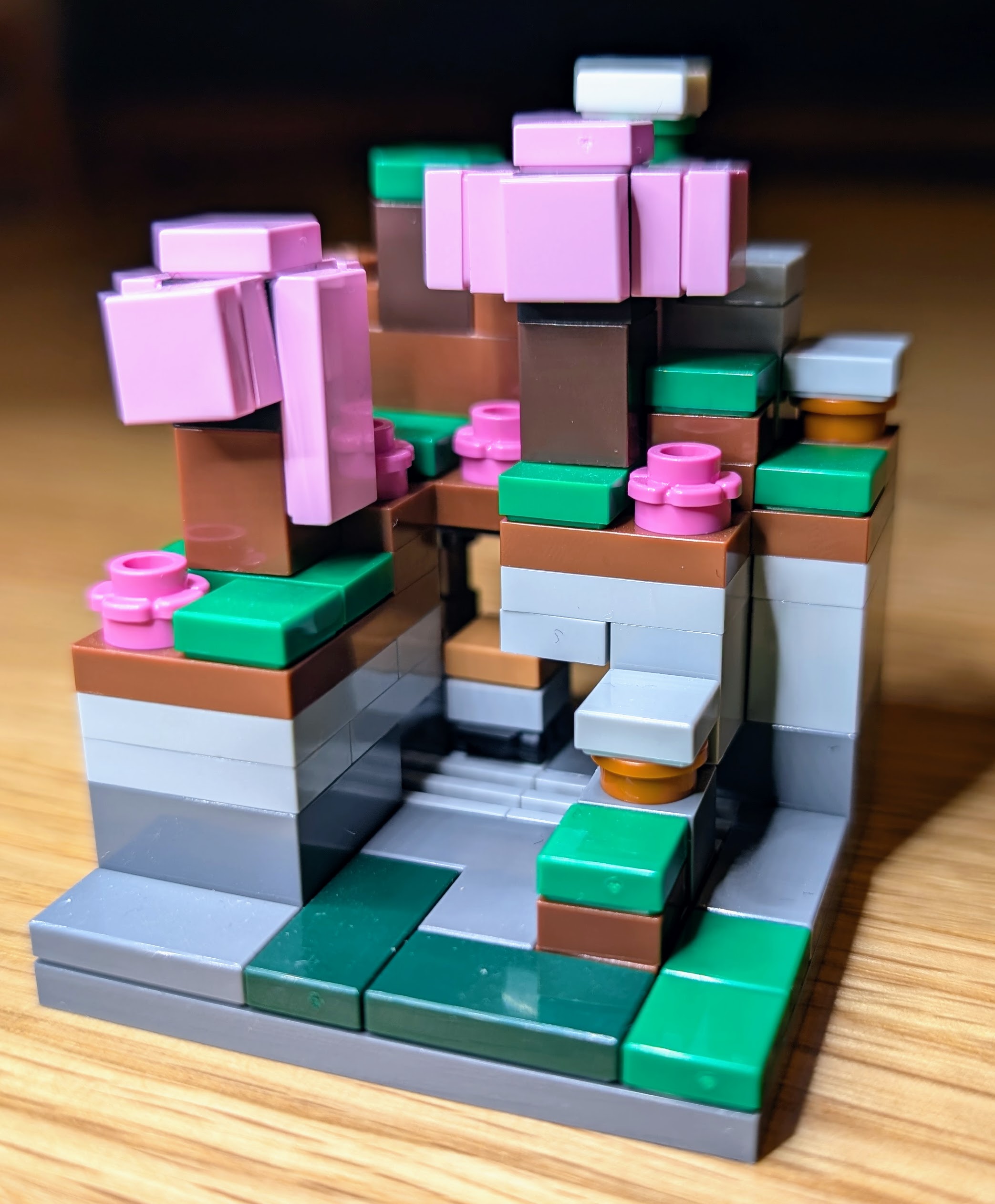 Another of the newer biomes is represented here. The cherry trees look somewhat lop-sided, but perhaps this represents the falling blossom you get in this biome in minecraft.